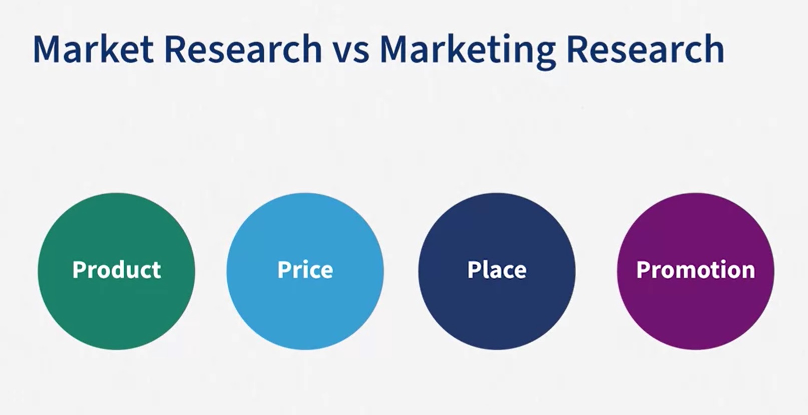 تحقیقات بازار بر جنبههای مرتبط با بازار مانند مصرفکنندگان متمرکز است؛ در حالی که تحقیقات بازاریابی بر جنبههای مرتبط با بازاریابی از جمله محصول، قیمت، کانالهای توزیع و تبلیغات متمرکز است. تحقیقات بازار بخشی جداییناپذیر از تحقیقات بازاریابی است. تحقیقات بازار به شرکتها کمک میکند تا مخاطبان بازار را با محصولات و خدمات مرتبط بهتر درک کنند و مخاطبان بازار را هدف قرار دهند. برای مثال، اگر شرکتی بخواهد زنان بین 30 تا 40 سالی را هدف قرار دهد که بیش از 200 میلیون تومان در سال درآمد دارند، باید تا حد امکان اطلاعات و دادههای مربوط به این بخش از بازار را جمعآوری کند. این امر به اطلاعرسانی و شکل دادن به تصمیمات استراتژی بازاریابی در رابطه با پتانسیل راهاندازی یک محصول جدید در این بازار کمک میکند.
